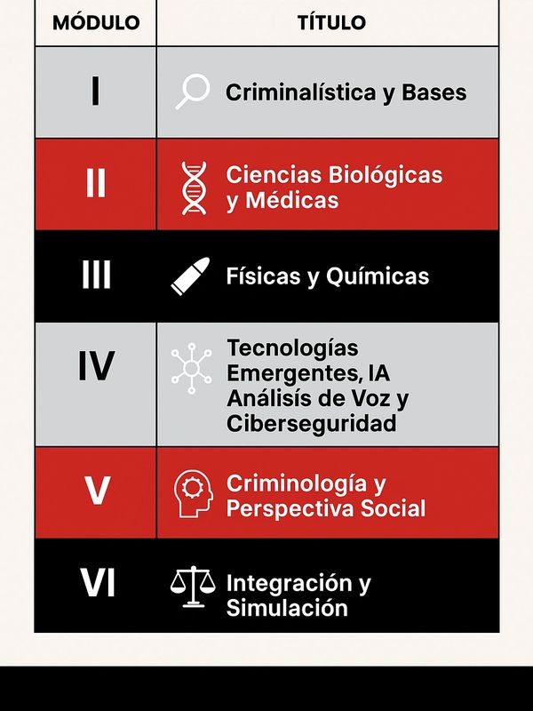 A lo largo de seis módulos, el participante vivirá una experiencia académica que integra criminalística, biología, química, criminología, tecnología e inteligencia aplicada, fortaleciendo su perfil profesional con herramientas de última generación.